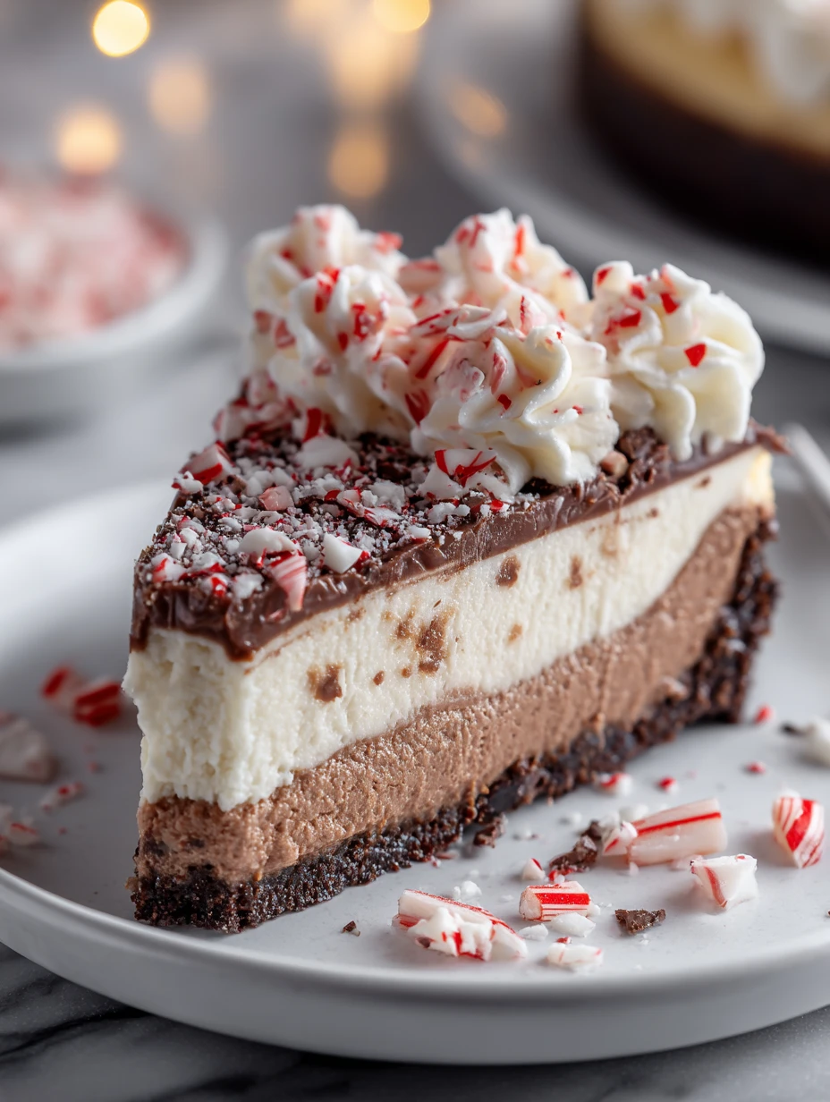 The cool peppermint flavor swirls beautifully through creamy cheesecake, creating a perfect contrast with the fudgy chocolate bottom. Crushed candy canes, whipped cream, and more chocolate on top give it a showstopping festive look that’s both fun and elegant.