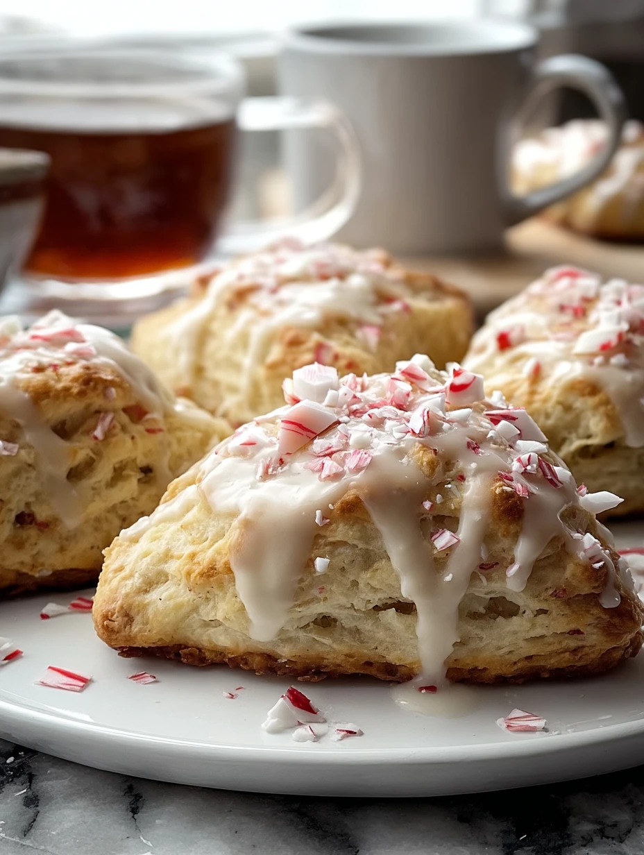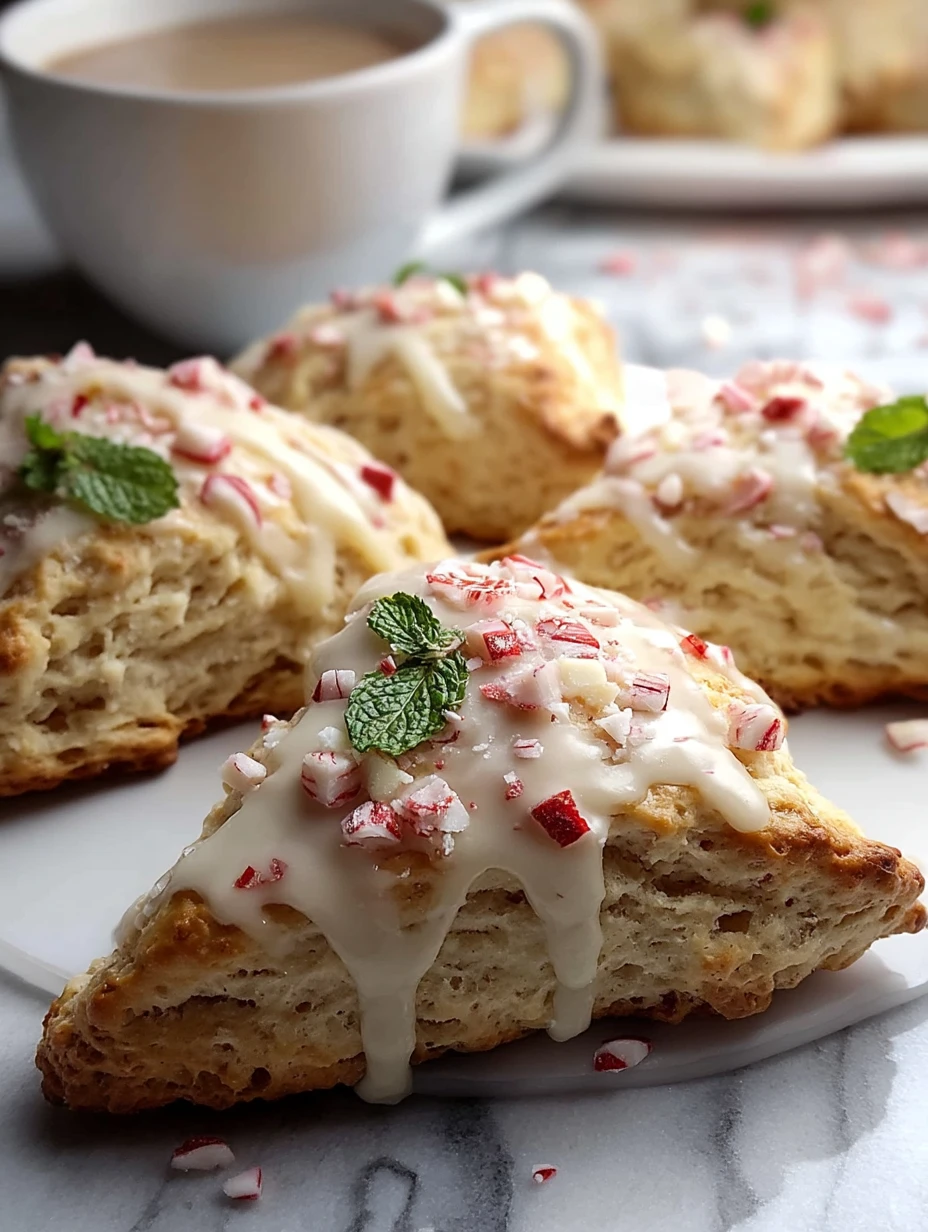 Melt the white chocolate, drizzle it over the warm or cooled scones, and sprinkle crushed peppermint candies over the top right away so they stick. Once the glaze sets, they are ready to serve.
