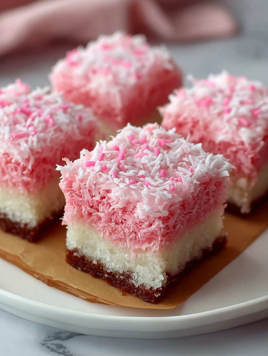 Each bite delivers a satisfying contrast: the brownie-like base is dense and fudgy, the middle layer brings a smooth, creamy coconut richness, and the final dusting of pink coconut flakes adds both texture and a pop of color. These are the kind of bars that spark conversation at potlucks, impress at bake sales, and disappear within minutes at family gatherings.
