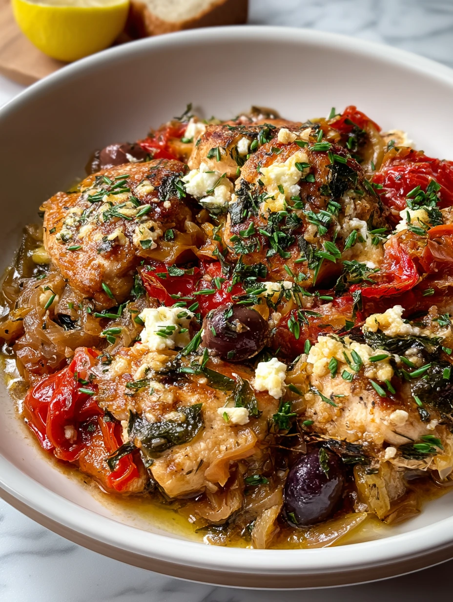 I love serving this straight from the skillet at the table—everyone can scoop a golden chicken thigh with a generous helping of lemony, cheesy orzo underneath. A final drizzle of good olive oil and a few extra olives on top make it feel restaurant-worthy.