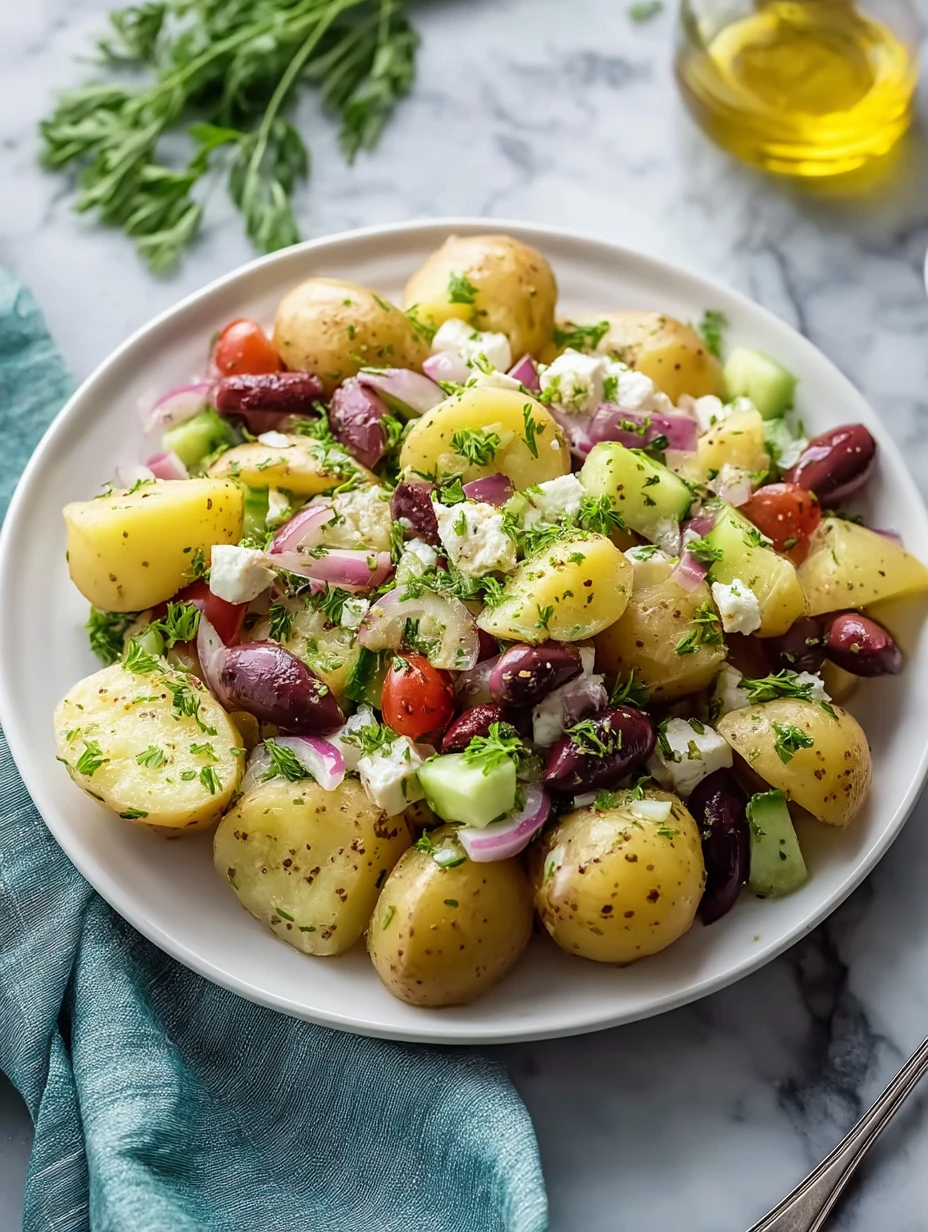 Fold in the cherry tomatoes, cucumber, red onion, and Kalamata olives. Stir gently so the vegetables stay crisp and the potatoes keep their shape.