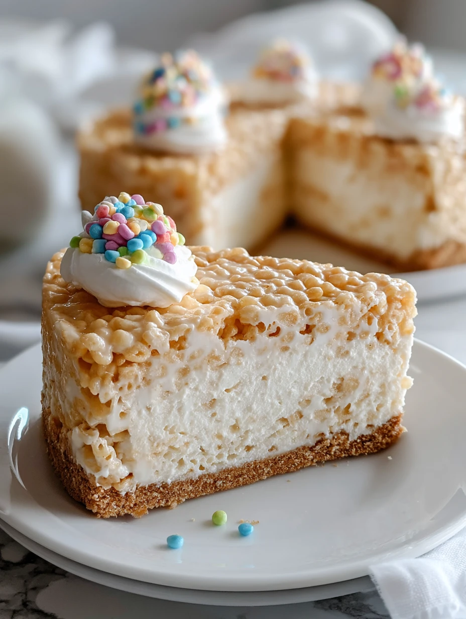 If a classic rice krispie treat and a creamy no‑bake cheesecake had a bakery baby, this would be it. This Rice Krispie Treat Cheesecake has a buttery graham cracker crust, a thick layer of marshmallow‑studded cheesecake filling with colorful sprinkles, and a chewy caramel‑kissed rice krispie topping.