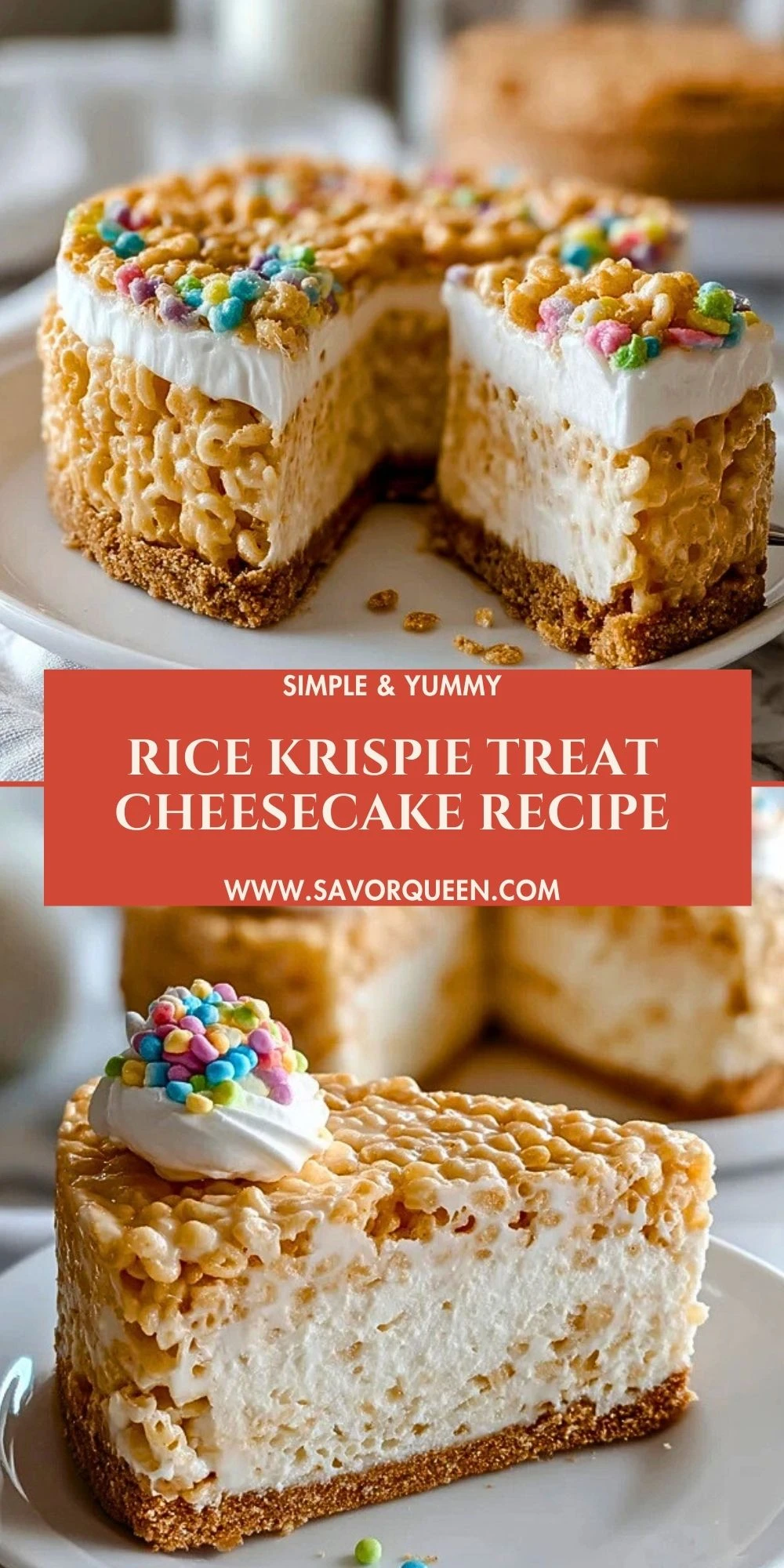 For me, this dessert is all about texture. You get the crunch of the graham cracker base, the cool, silky cheesecake center, and the gooey, stretchy rice krispie layer on top. It’s no‑bake, easy to prep ahead, and it turns every day into a little celebration thanks to those funfetti sprinkles.