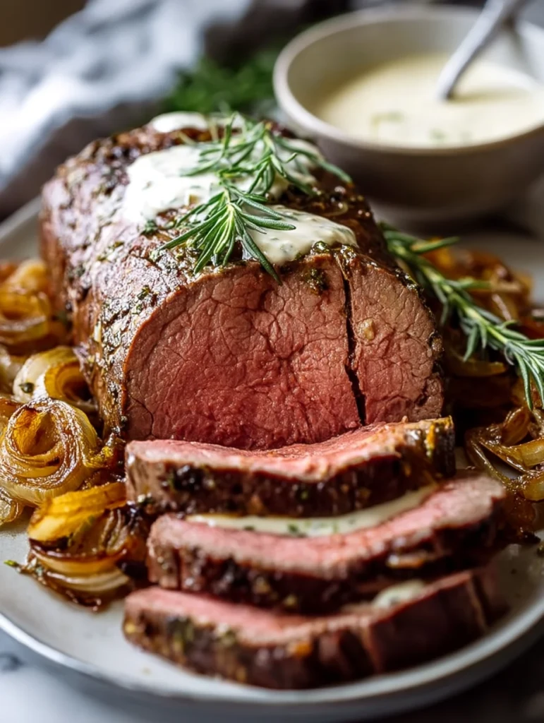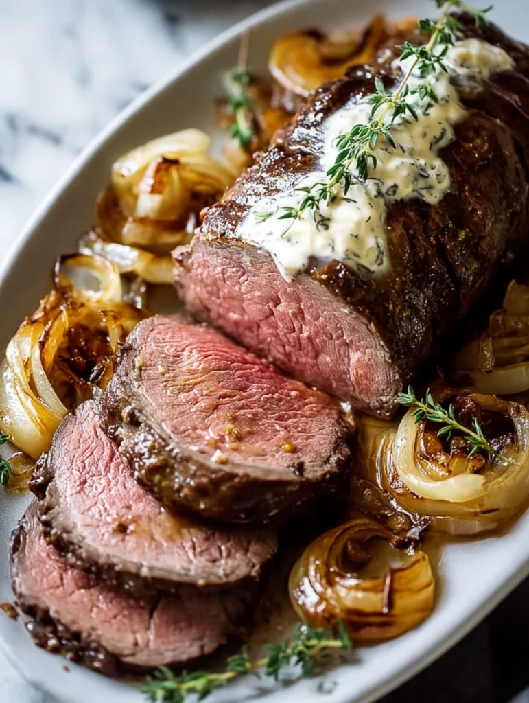 Treat yourself and your guests to an unforgettable meal with this Roasted Beef Tenderloin with French Onions and Horseradish Sauce. Juicy, tender, and boldly flavored, this one-pan dish is the perfect centerpiece for holidays, special occasions, or even an elevated Sunday dinner. The beef tenderloin roasts atop a bed of buttery caramelized onions, while a cool horseradish cream sauce brings a tangy contrast. It’s an easy recipe with stunning results—ideal for anyone looking for easy dinner ideas, holiday food ideas, or an impressive beef tenderloin roast for gatherings. With every bite, you’ll taste the love.