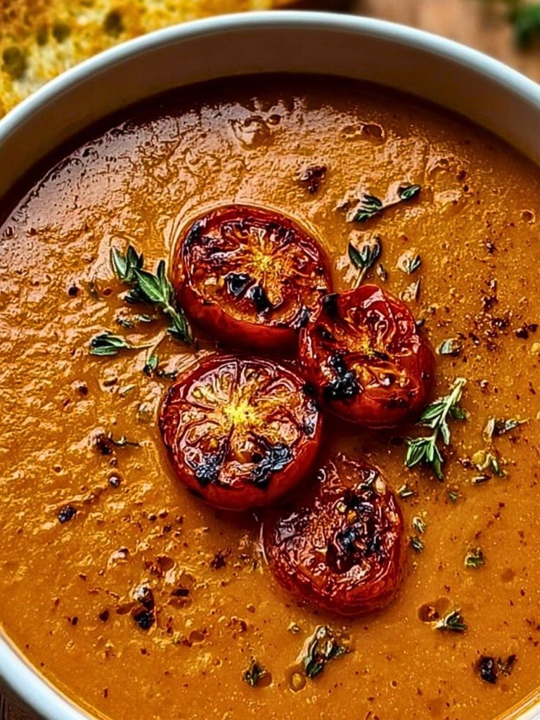 Ladle the soup into bowls and top with a few roasted tomato slices, a sprig of thyme, and freshly cracked black pepper. Serve warm.