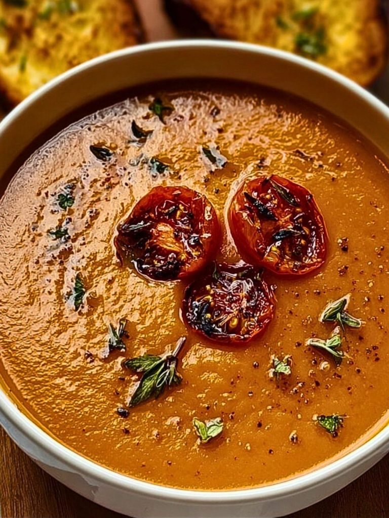Roasted Tomato Soup is best served piping hot with toppings like fresh herbs, roasted tomatoes, or a dollop of crème fraîche. It’s ideal for pairing with crunchy toast or melty grilled cheese sandwiches.