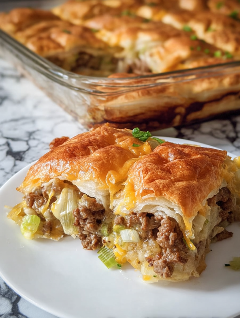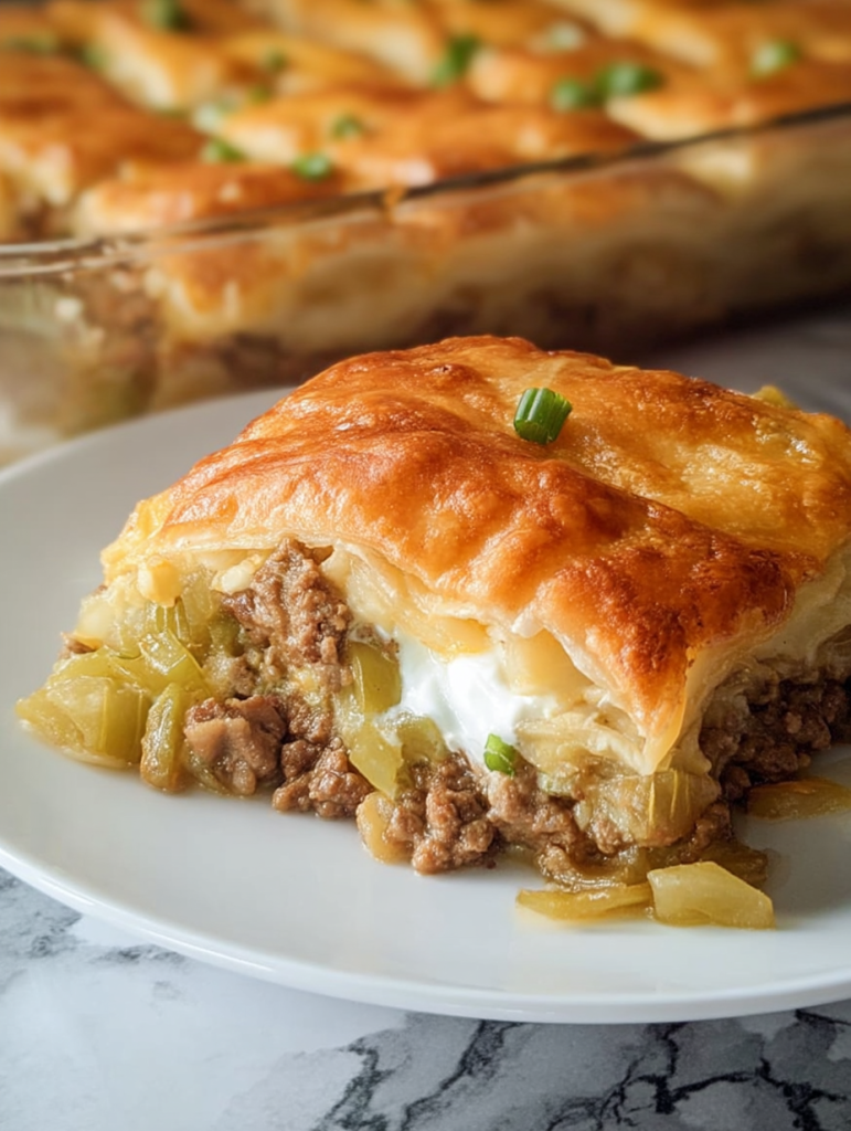 Whether you’re craving a hearty weekday meal or introducing friends to a Nebraska classic, this casserole is a guaranteed crowd-pleaser. The rich beef filling melds perfectly with the buttery puff pastry, while the cabbage adds that warm, earthy flavor you didn’t know you were missing. It’s rustic, filling, and impossible to resist.