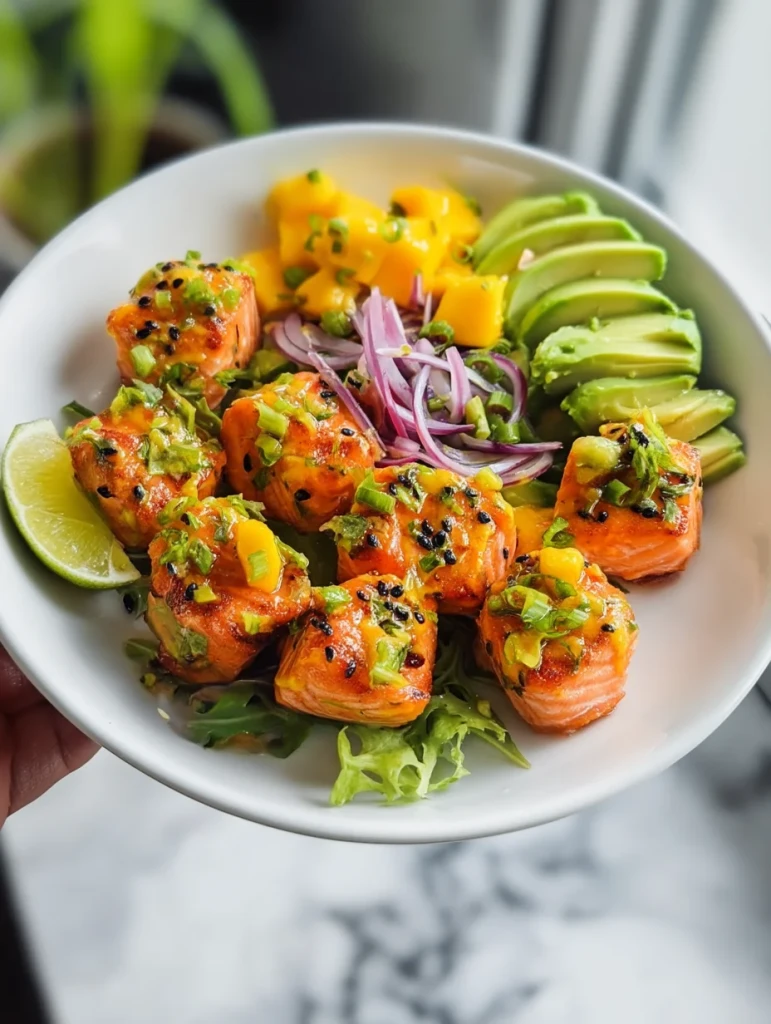 Elevate your mealtime with this stunning bowl of Salmon Bites with Creamy Mango-Avocado Salsa and Lime Zest. Perfectly seared salmon pairs with creamy avocado, juicy mango, and zesty lime in every forkful. Whether you’re after a quick dinner, easy recipe for lunch, or vibrant food ideas to impress your guests, this healthy bowl covers all the bases. Packed with omega-3s and fresh produce, it’s a standout in dinner ideas and quick lunch bowls. Add this to your list of go-to healthy snack or light dinner solutions!