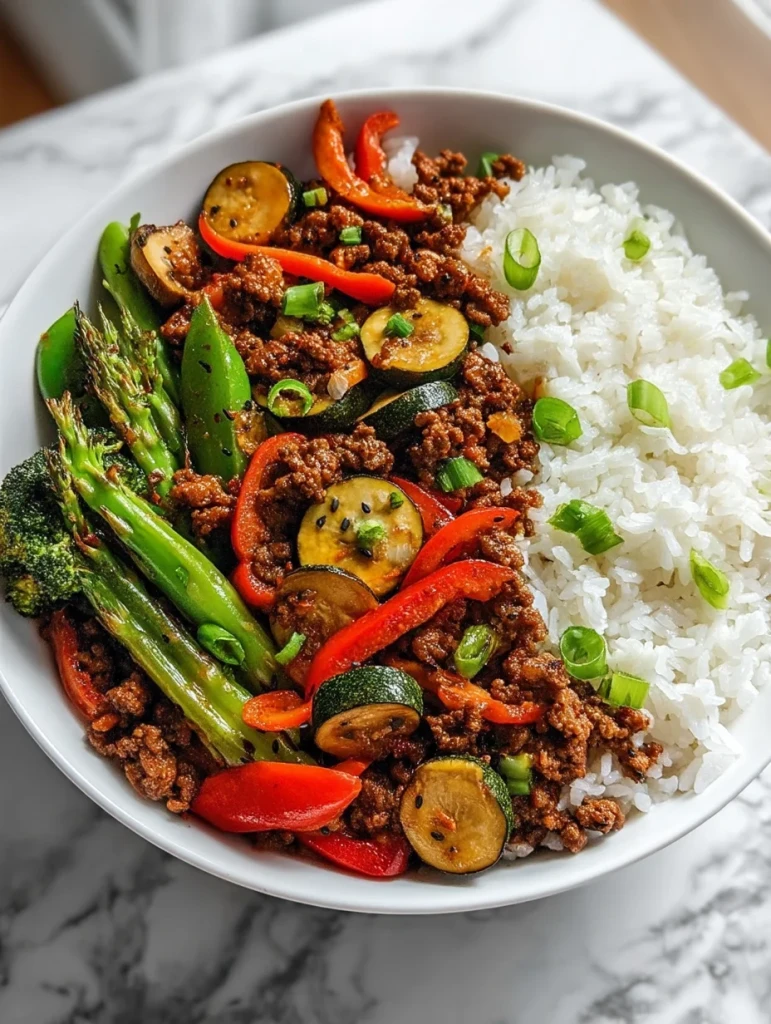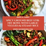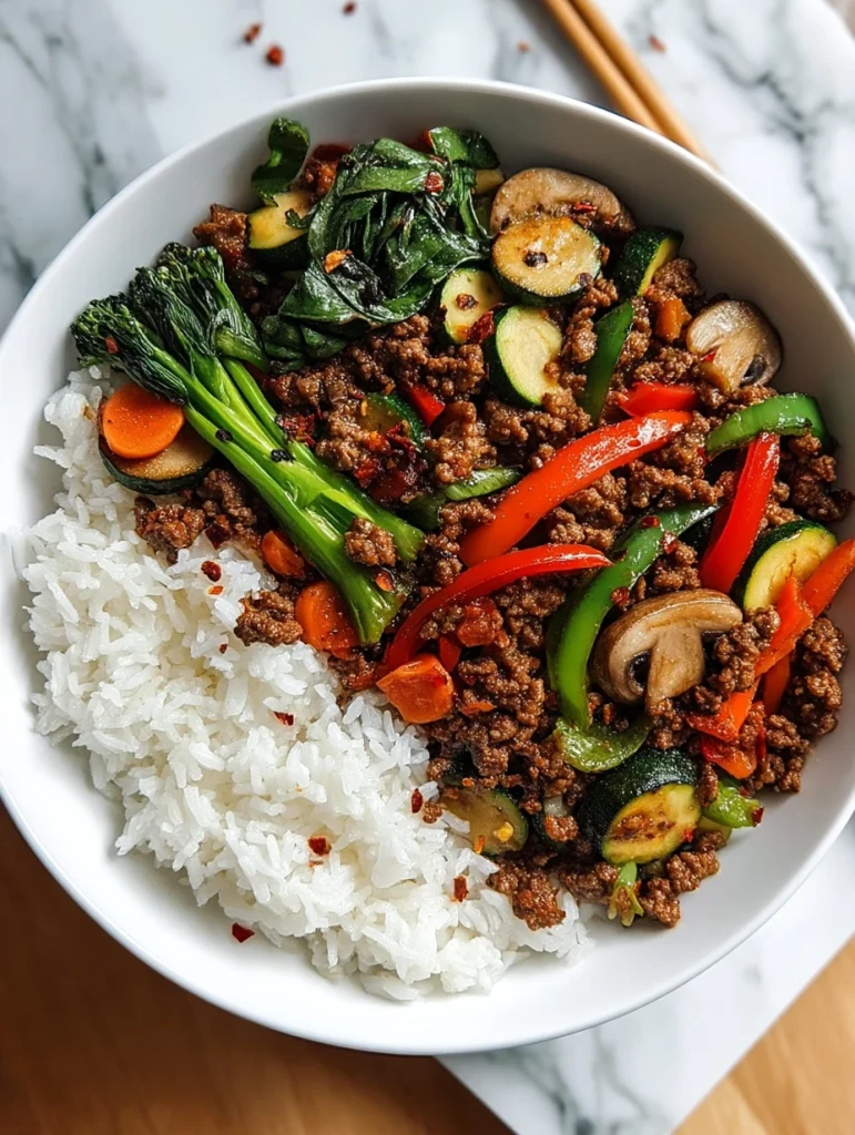 Spicy Ground Beef Stir-Fry Bowl with Garlic Veggies & Steamy Rice
