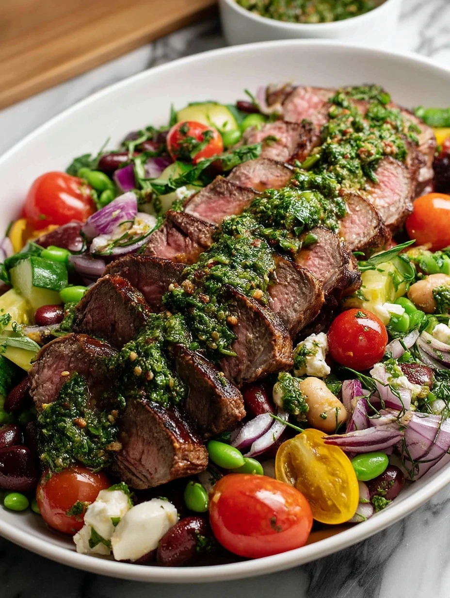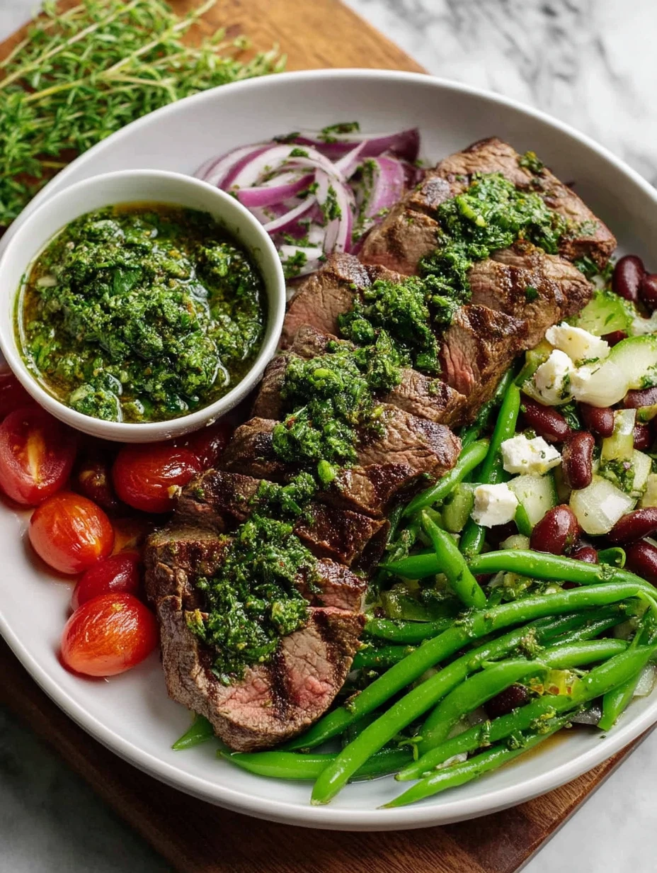 This Steak Chimichurri & Dense Bean Salad is a powerhouse of bold flavors, fresh vegetables, and high-protein satisfaction. Tender grilled steak layered over a medley of cannellini beans, cherry tomatoes, crisp cucumbers, and arugula, all drizzled with herbaceous chimichurri and topped with tangy feta. It’s the perfect blend of savory, zesty, and hearty—ideal for quick dinner ideas, easy lunch recipes, or healthy food ideas packed with nutrients and style. Whether you’re meal-prepping or hosting, this easy recipe delivers every time.