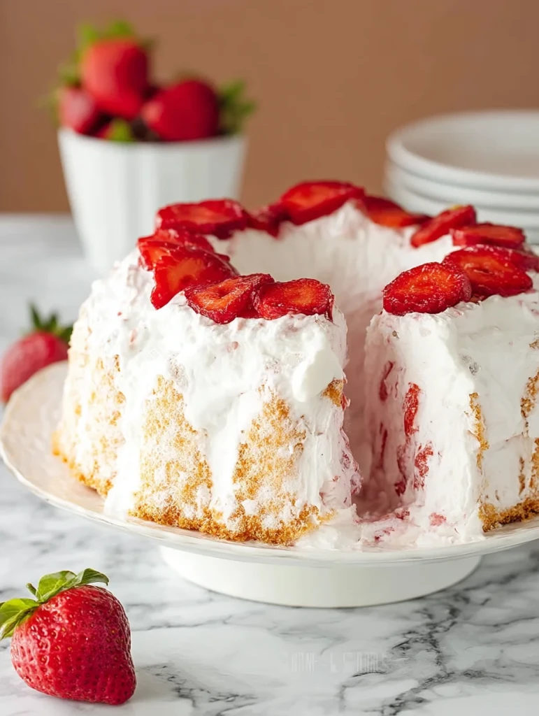 Keywords: strawberry cake, no-bake dessert, easy strawberry recipe, angel food cake, summer dessert