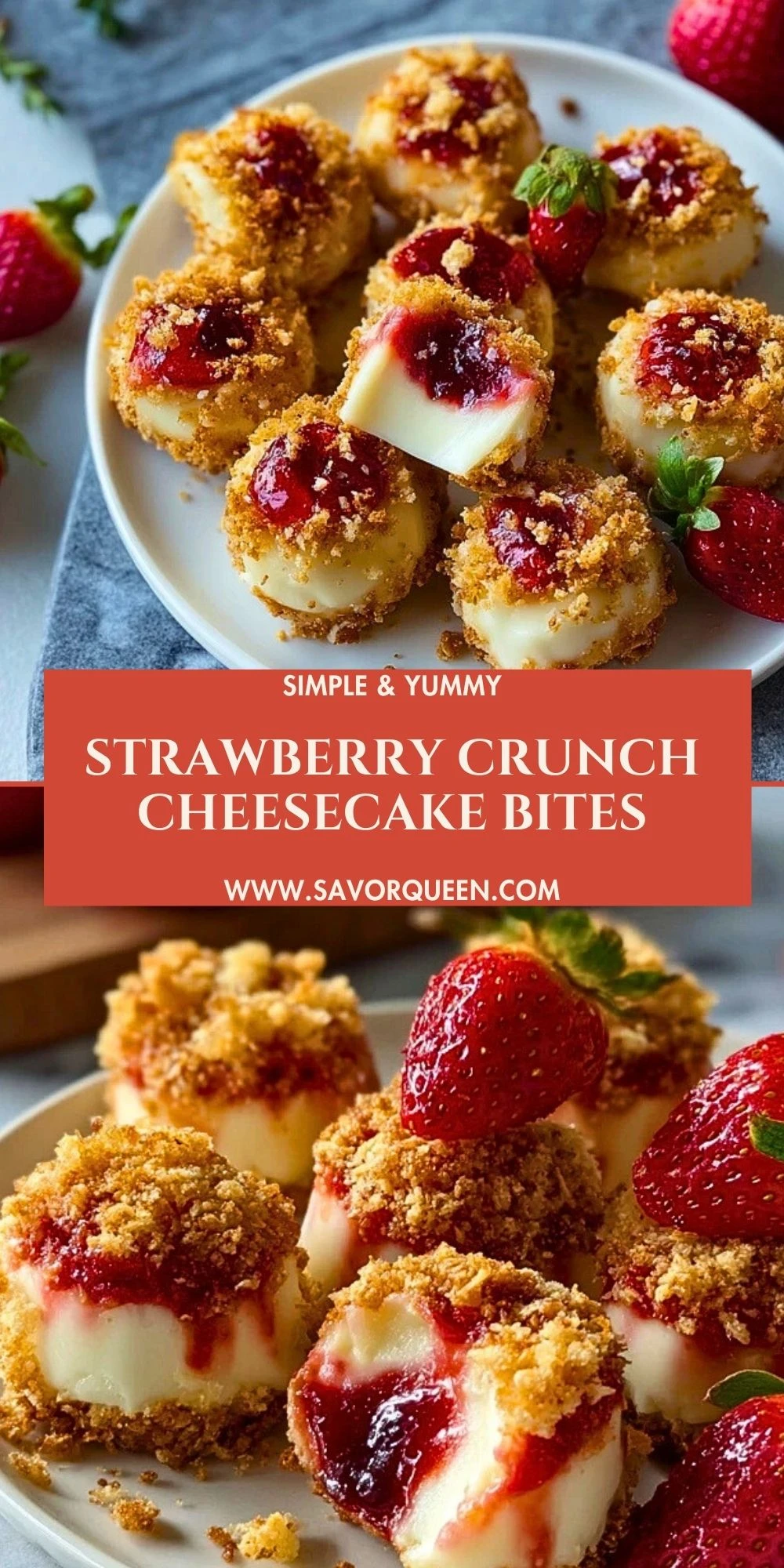 Keywords: strawberry cheesecake bites, strawberry crunch cheesecake, no bake cheesecake bites, easy dessert, party desserts, food ideas, easy recipe, dessert ideas