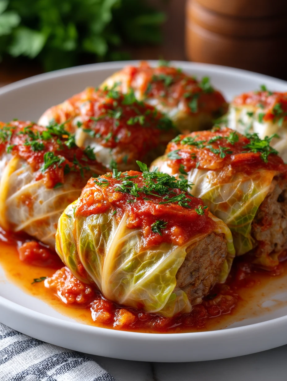 Let the stuffed cabbage rolls rest for about 10 minutes so the juices settle and the rolls firm up slightly. Spoon extra sauce over the top, sprinkle with chopped fresh parsley, and serve warm with your favorite creamy or starchy sides.