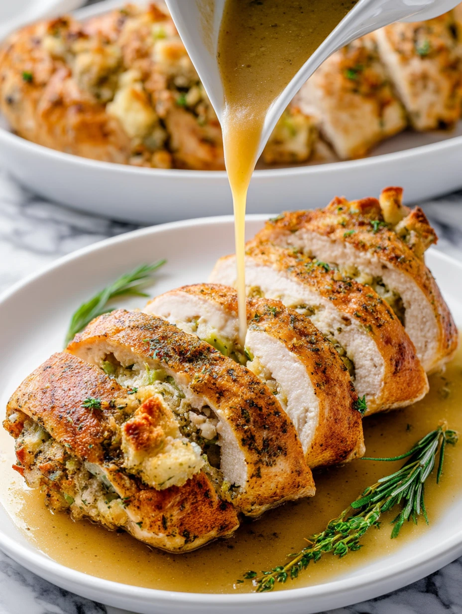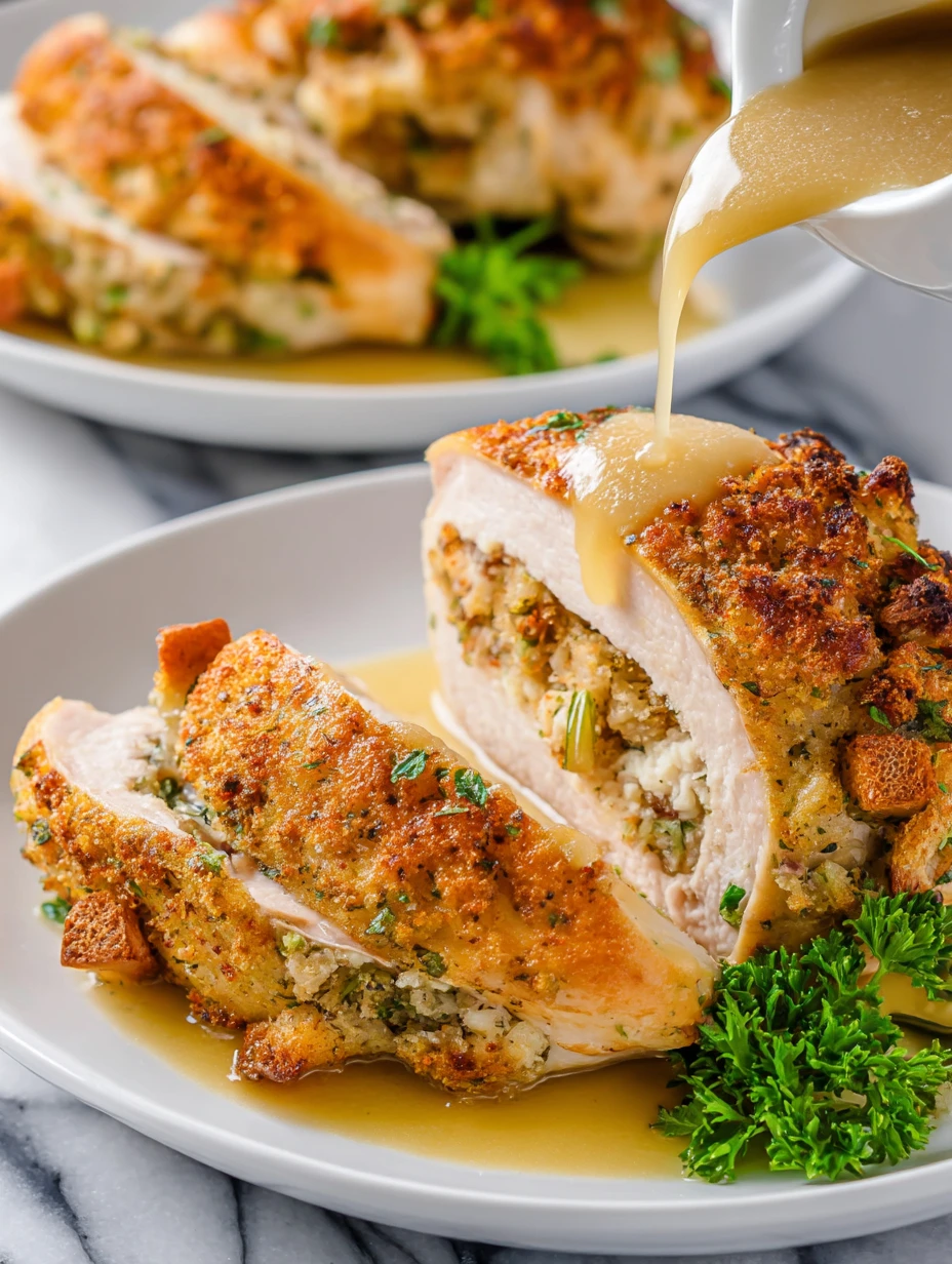 Treat yourself to the ultimate comfort food experience with these Stuffing Stuffed Chicken Breasts. Perfectly juicy chicken is filled with savory homemade stuffing, seasoned to perfection, and topped with warm, velvety gravy. This hearty dish is a standout among easy dinner ideas and makes an excellent main course for cozy nights, holiday spreads, or Sunday family meals. From quick weeknight dinner options to creative food ideas that wow, this recipe brings classic comfort right to your plate. Ideal for anyone searching for easy recipes, dinner inspiration, or hearty, family-style cooking.