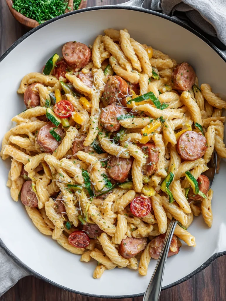 Keywords: easy dinner, pasta, kielbasa, creamy pasta, weeknight dinner