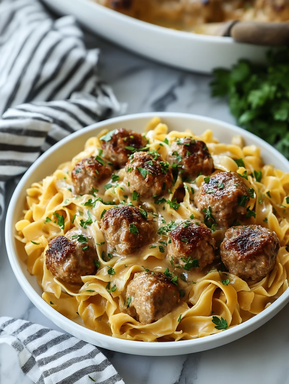 Pour most of the creamy gravy over the noodles in the baking dish, tossing gently to coat them from top to bottom. Nestle the browned meatballs evenly over the noodles, then drizzle the remaining sauce over the top so everything is lightly blanketed.