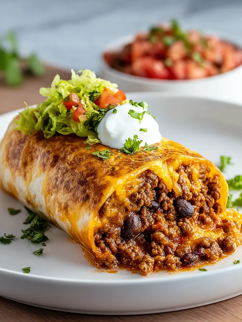 This stuffed beef burrito is what happens when comfort food meets serious flavor. Perfectly seasoned ground beef, fluffy Mexican rice, hearty black beans, and gooey melted cheese all wrapped in a warm tortilla, then baked to golden perfection. Each bite is a perfect balance of creamy, spicy, cheesy, and savory goodness—and it’s topped with your favorite burrito fixings like sour cream, guacamole, and salsa for the ultimate indulgence.