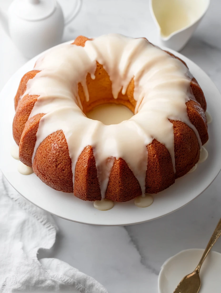 Let the cake cool in the pan for 15 minutes, then invert onto a wire rack. Once cool, drizzle with glaze made from powdered sugar and milk until it flows beautifully down the sides.