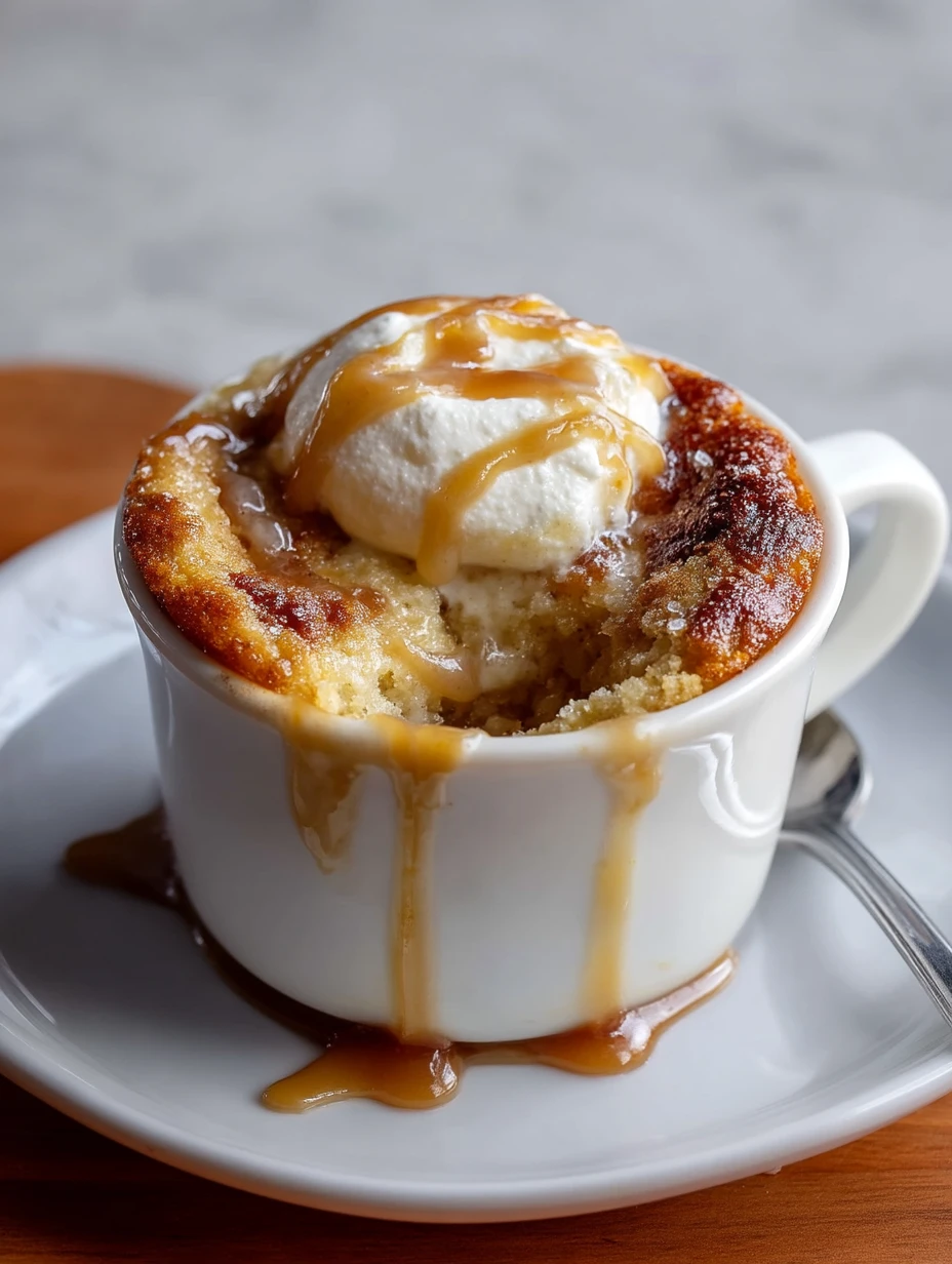 Warm cake and melting vanilla ice cream is my weakness. The cold creaminess against the hot, cinnamon‑apple center turns this simple mug cake into a full dessert.